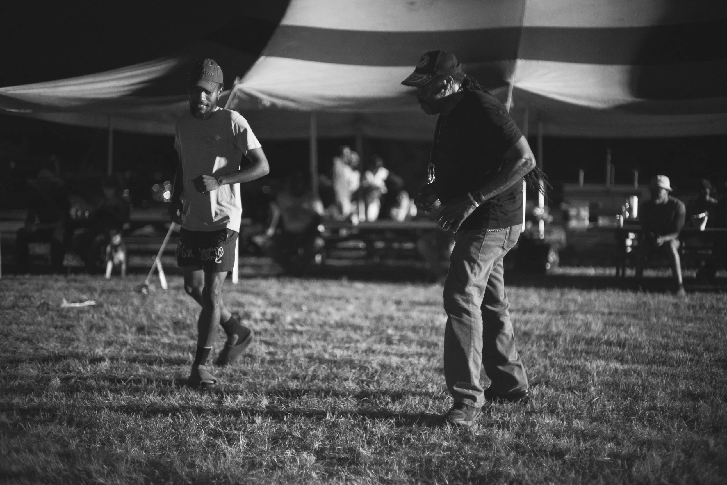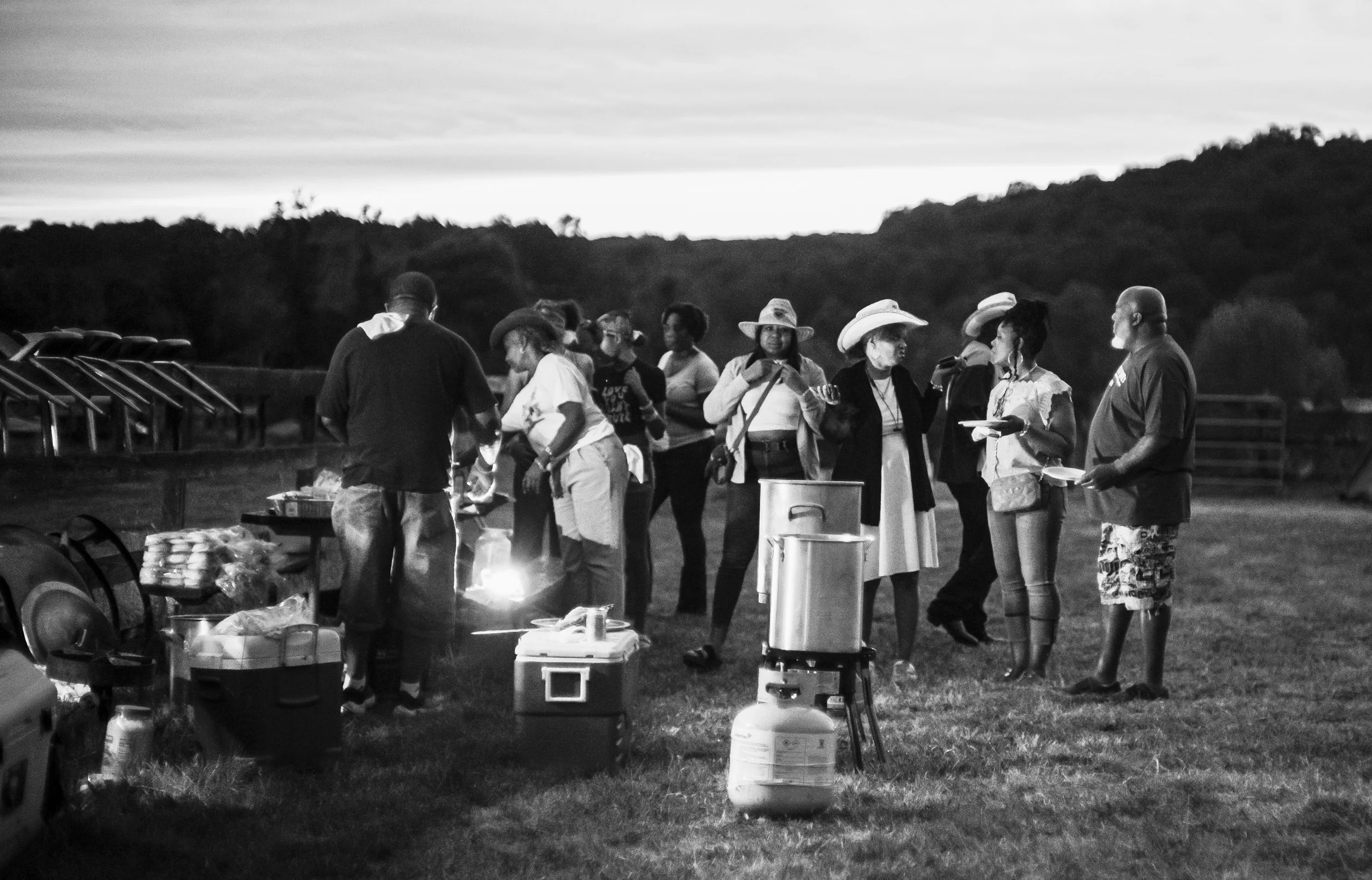 CLINTON TOWNSHIP, NEW JERSEY: Tyshawn Davis (left) of the Crazy Faith Riders of New Jersey and JR of the Federation of Black Cowboys during a party after the club’s signature trail ride in Round Valley. Friends and members line dance. (Brian Branch-Price/TheFotoDesk)