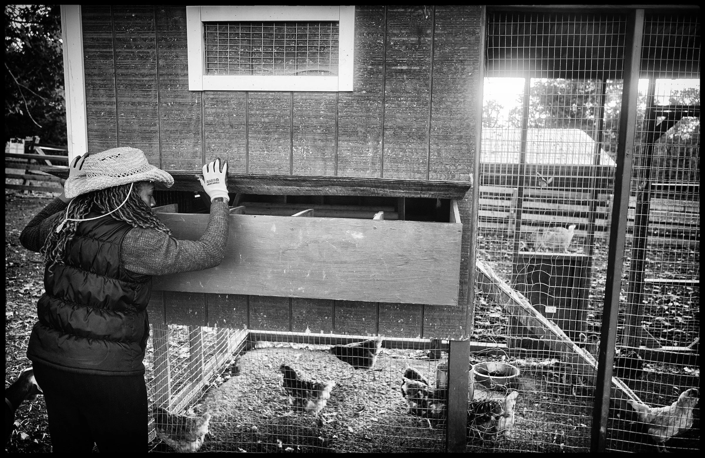 Tammy Harris checks for eggs in one of the chicken pens, New Joy Farms . (Brian Branch-Price for Public Square Amplified)
