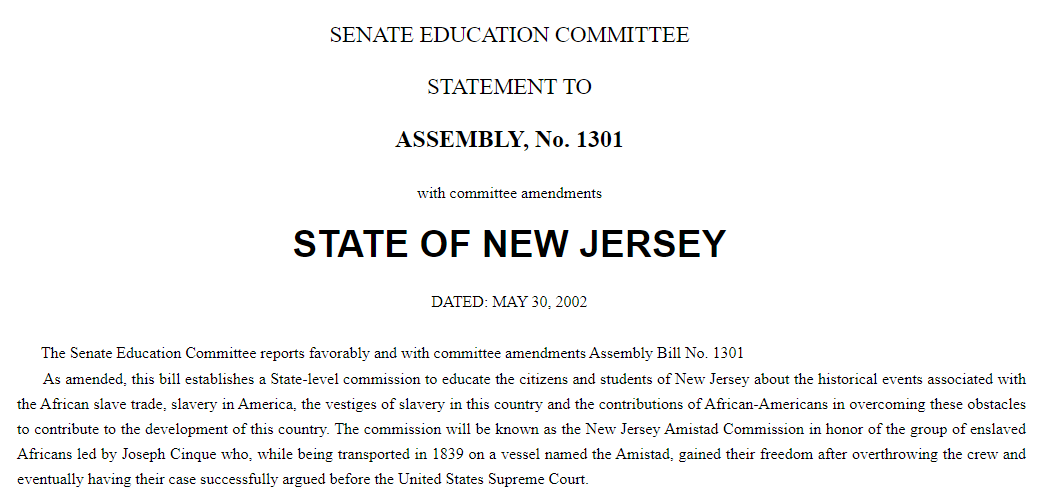 If the Amistad curriculum, named for the successful 1839 uprising aboard the slave transport Amistad, is not actually a curriculum in the way we often imagine, it’s natural to wonder what exactly it is, and why it has become nearly invisible and mostly unheard of. In the context of New Jersey legislation, Amistad references the 2002 statute which established an emphasis on the inclusion and enforcement of African American studies, contributions, and stories being placed in rightful context in history and English Language Arts classes within all New Jersey public schools.