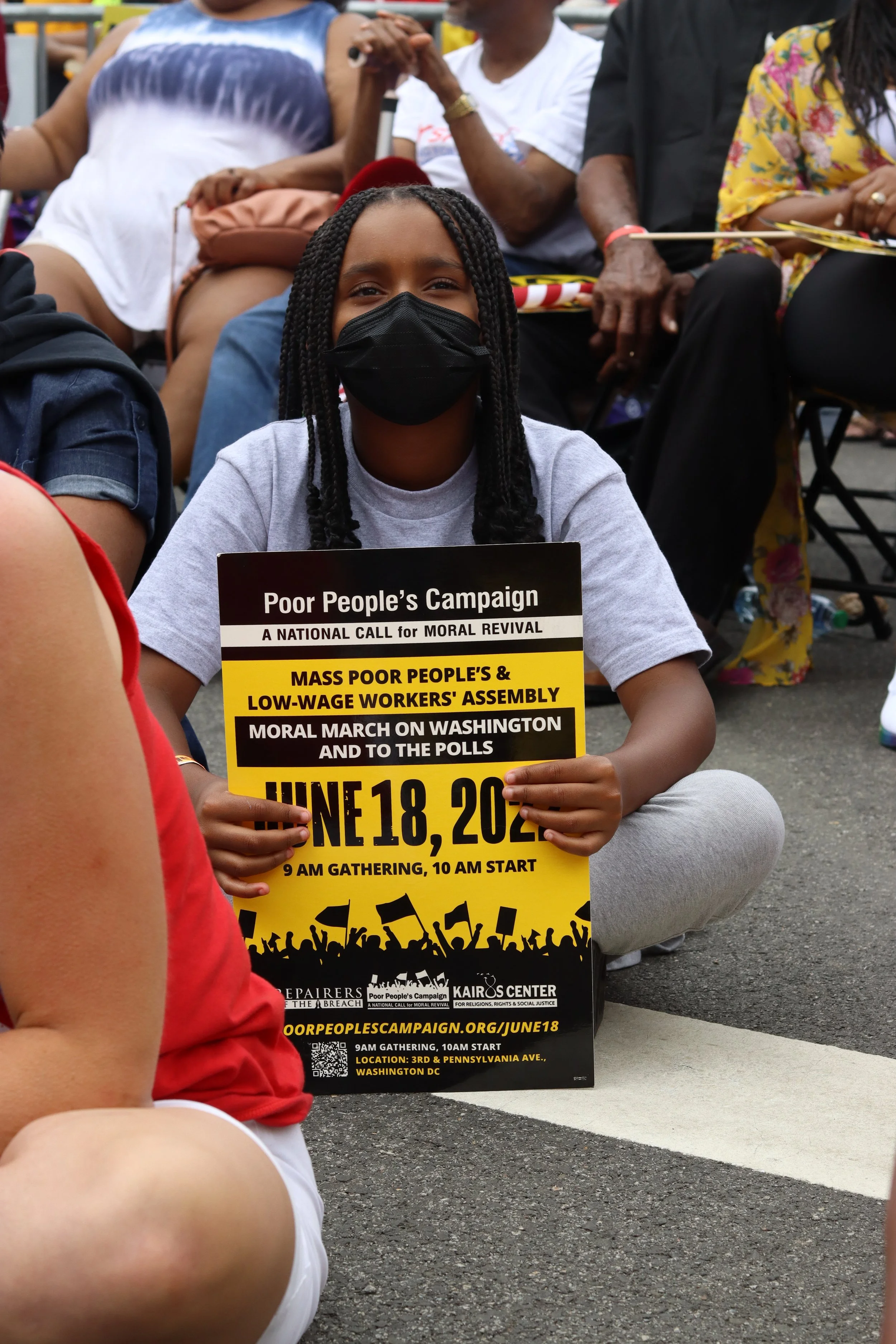 A young girl holds a flyer at the Mass Poor Peoples and Low-Wage Workers’ Assembly and Moral March in Washington D.C. on June 18, 2022. (Esther Paul for Public Square Amplified)