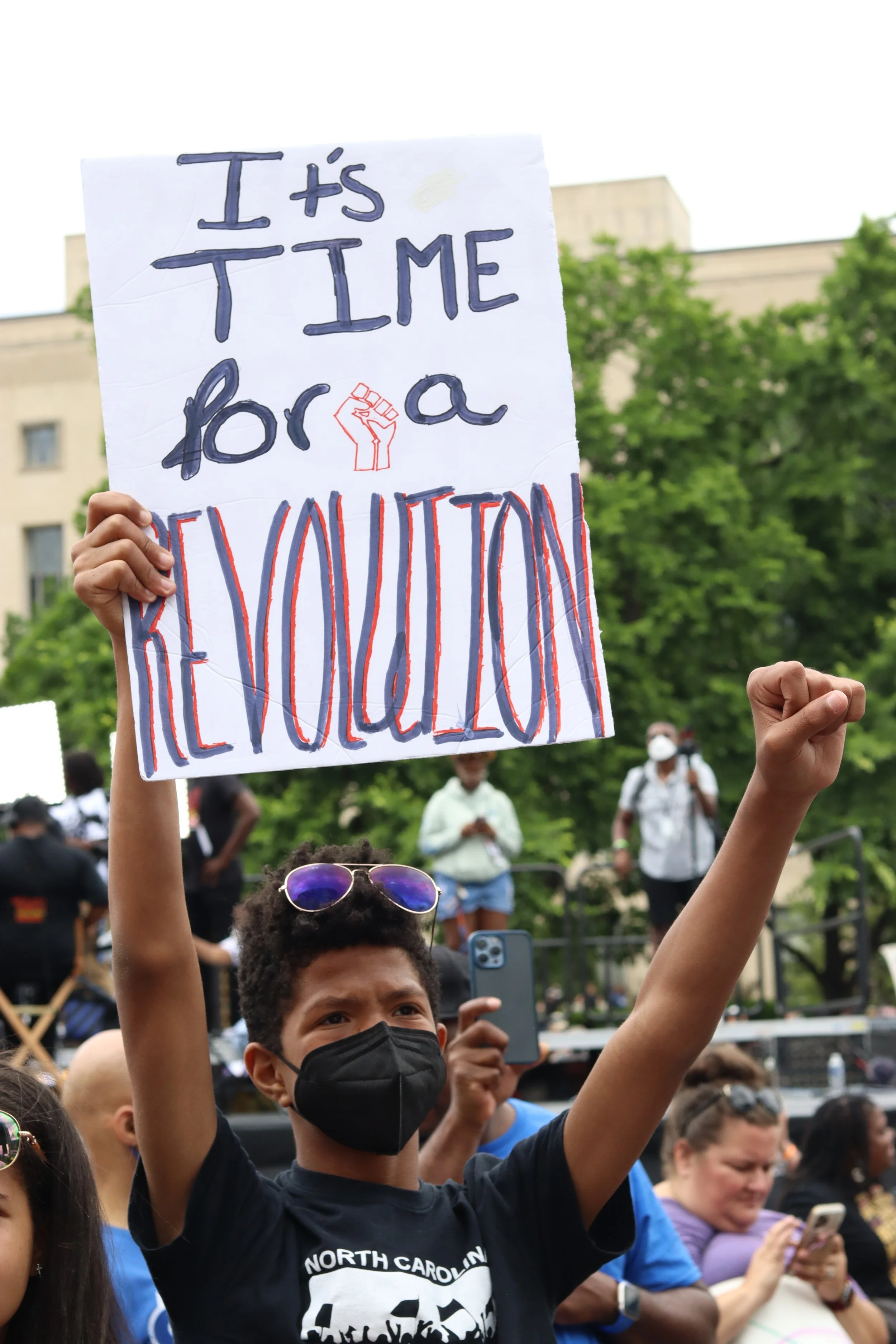 A young boy holds up a placard at the Poor People’s Campaign (PPC) Mass Poor Peoples and Low-Wage Workers’ Assembly and Moral March in Washington D.C. on June 18, 2022. (Esther Paul for Public Square Amplified)