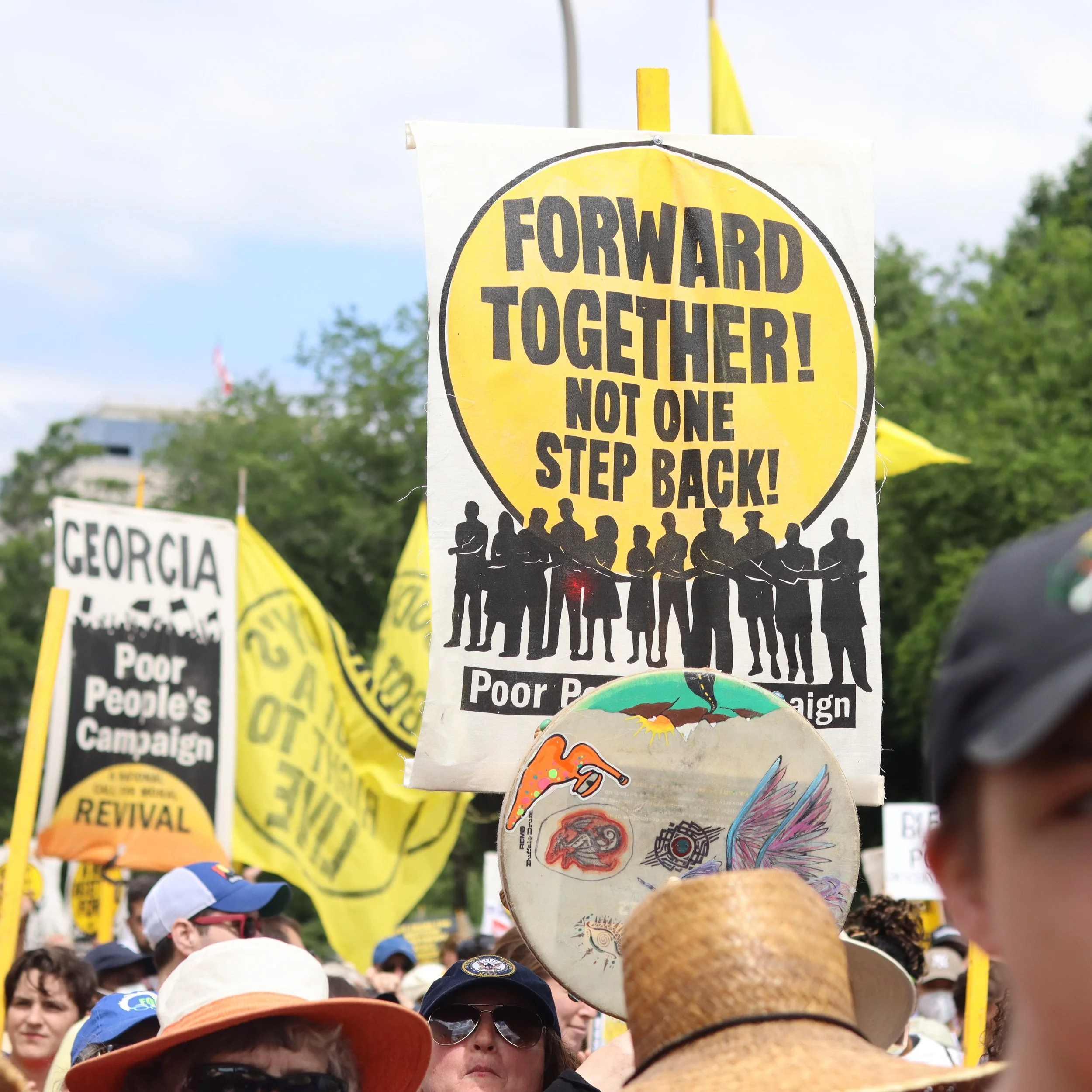 Marchers of the Poor Peoples Campaign (PPC) held placards during the Mass Poor Peoples and Low-Wage Workers’ Assembly and Moral March in Washington D.C. on June 18, 2022. (Esther Paul for Public Square Amplified)
