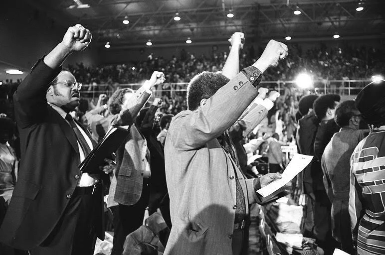Delegates hold their fists up at the National Black Political Convention in Gary, Indiana 1972. (Photo courtesy of LeRoy Henderson)