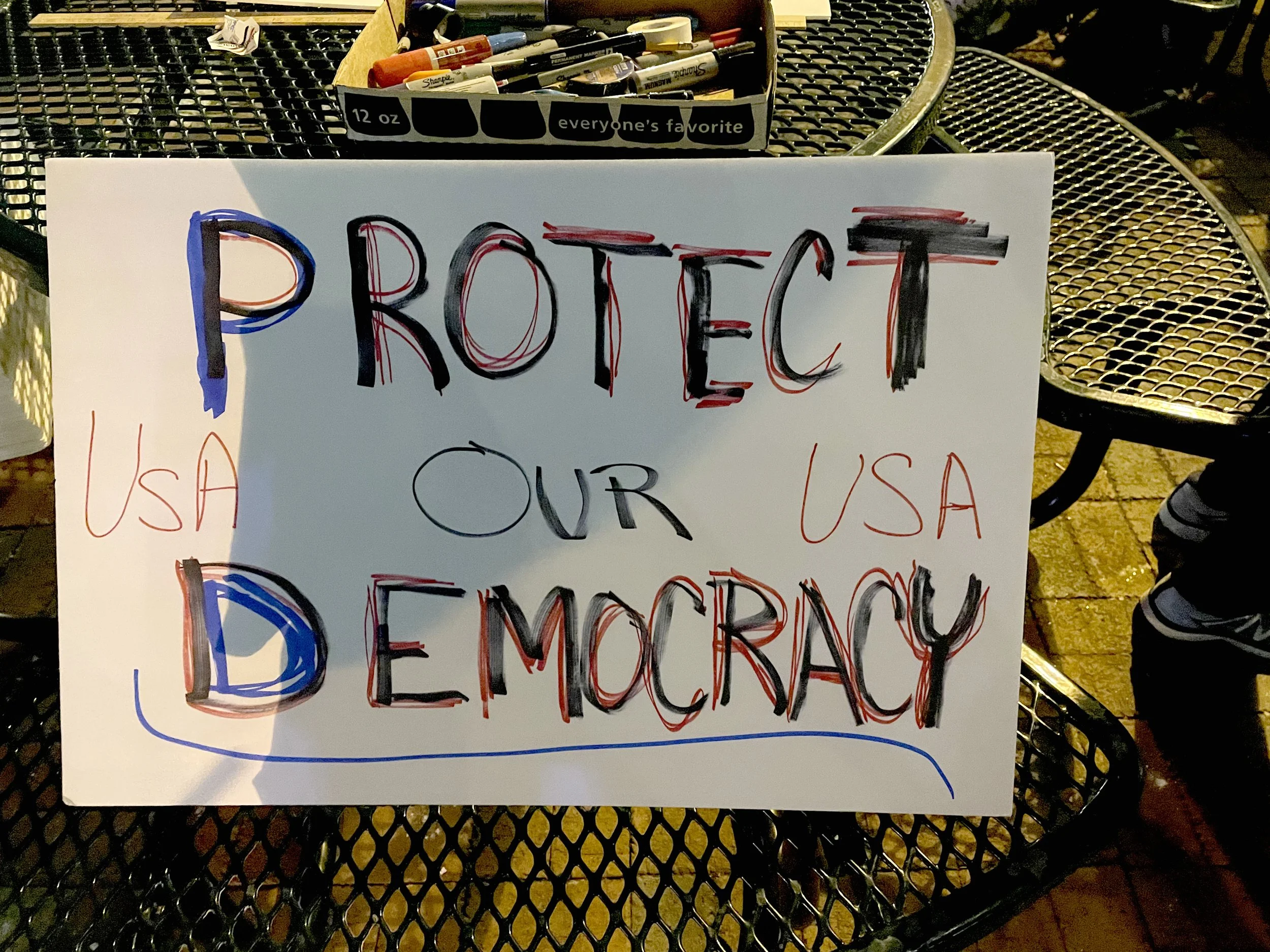 A handmade democracy placard at the ‘Mobilization for Democracy rally,’ Jan. 6, 2022 (Josie Gonsalves for Public Square Amplified)