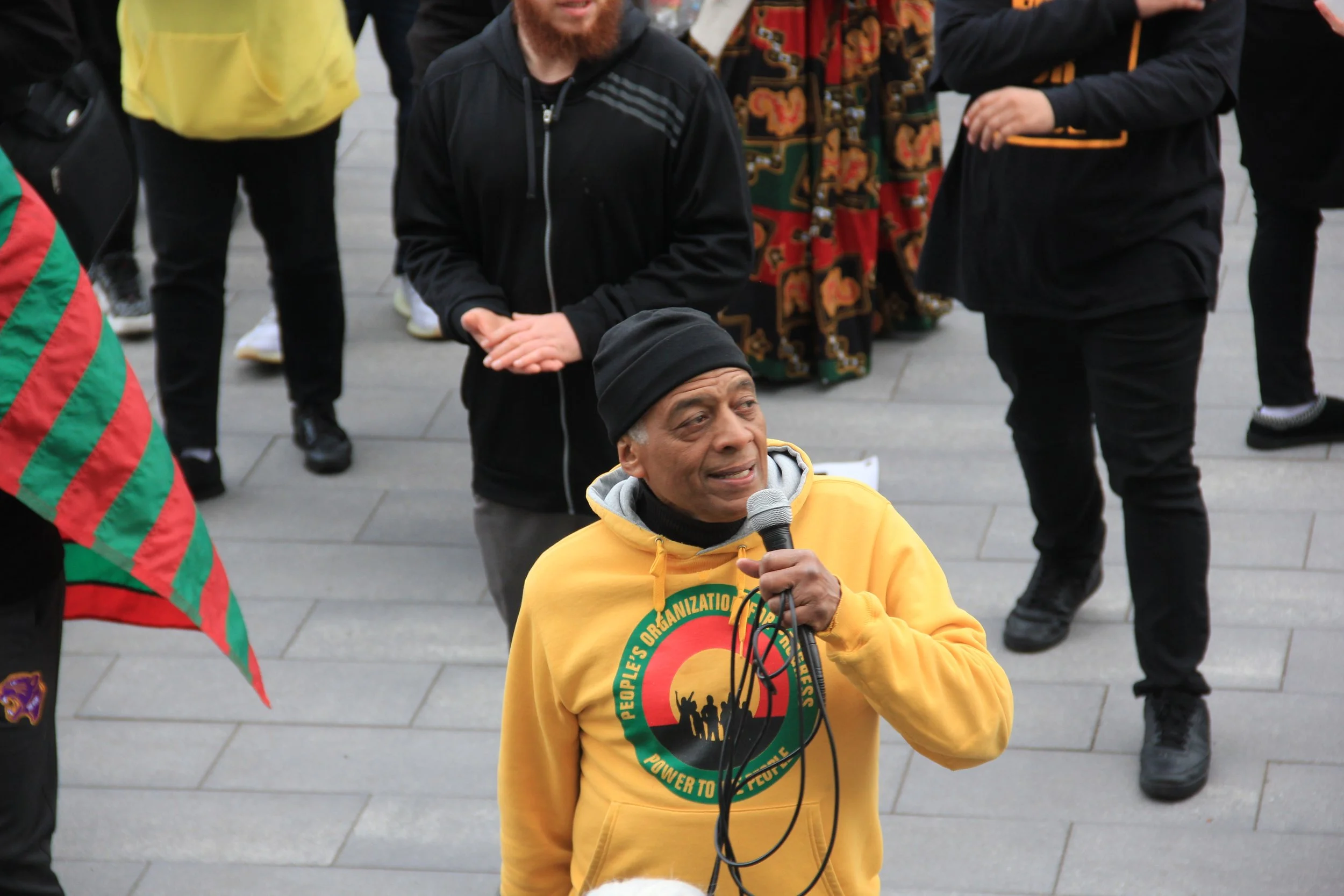 Lawrence “Larry” Hamm gives a speech among protestors at the Voting Rights March on Jan. 15, 2022. (Josie Gonsalves for Public Square Amplified)