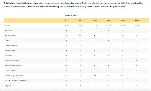 In a recent Quinnipiac University poll released on September 17th, 1,238 likely voters answered questions to determine the priority issues that could affect voter turnout. Thirty percent of participants said taxes were the most crucial issue, topping the list. Fourteen percent of people cited ethics in government as the most critical issue. Less than 10% of people each said that inflation, immigration, crime, unemployment, healthcare, schools, electricity costs, affordable housing, and mass transit were the most important issues.