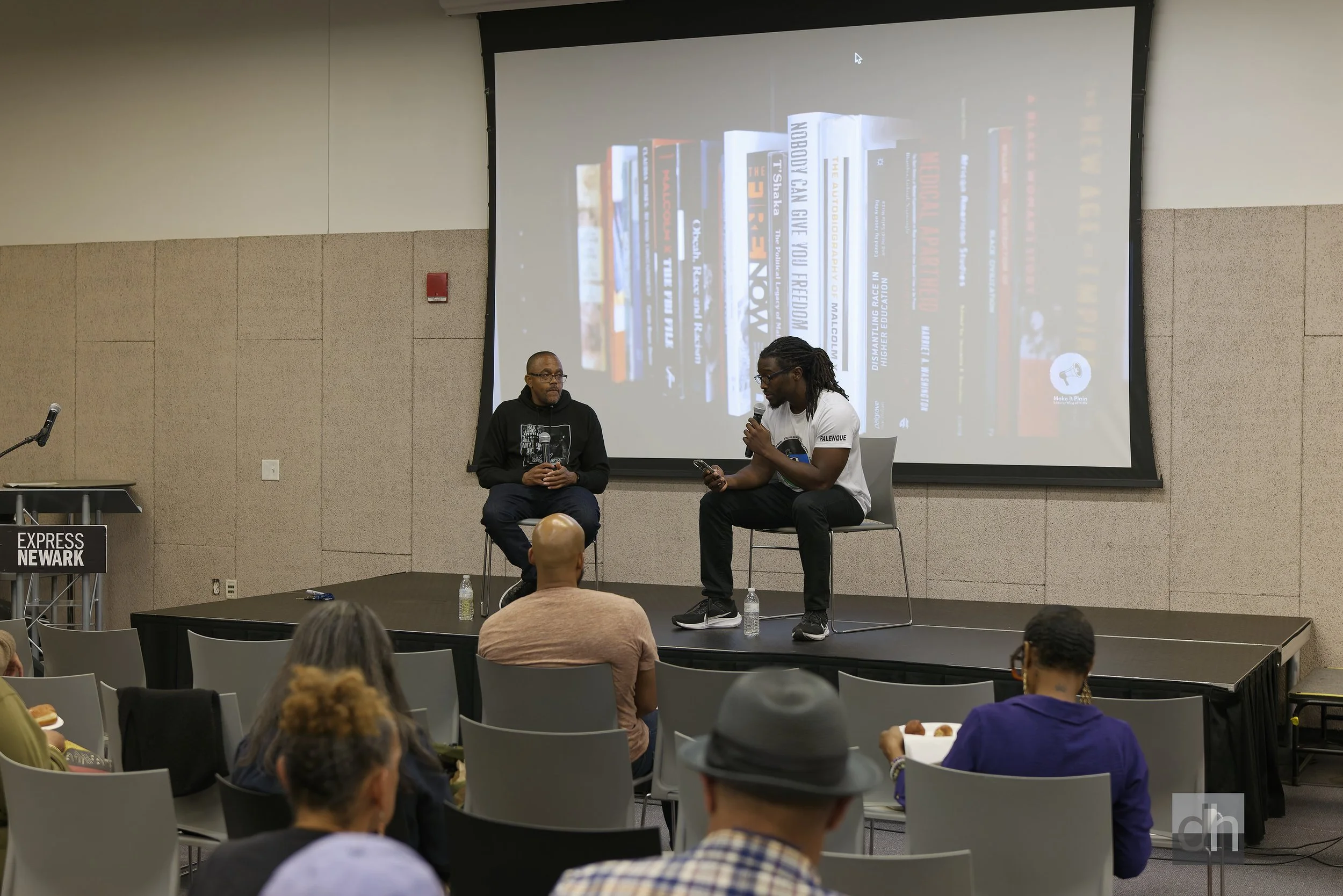 Photo credit: Author Kehinde Andrews interviewed by CMB Newark co-leader, JP, at the Nobody Can Give You Freedom book at Express Newark on September 10, 2025. Photo courtesy of Dennis Hill Photography.
