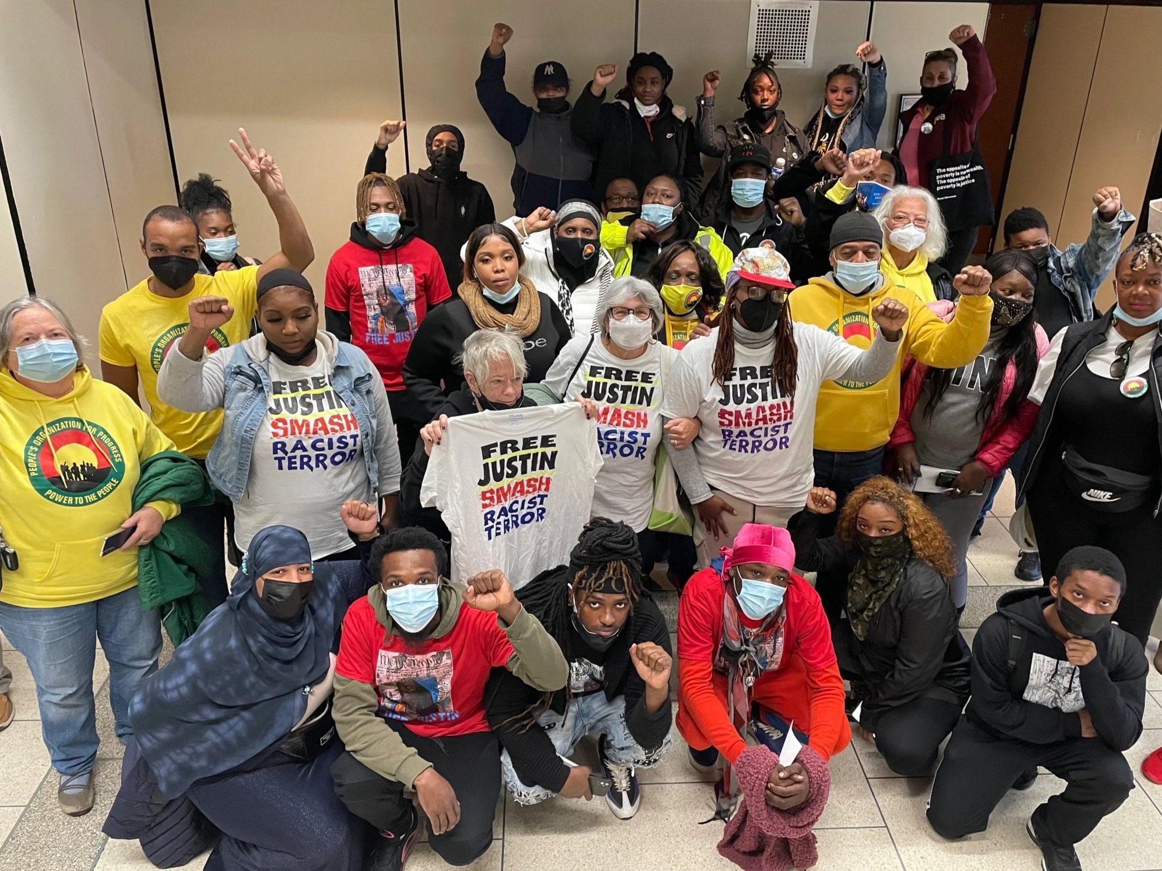 "Free Justin!" observers chanted as Justin walked out of the courtroom. They stood up in solidarity, shouting for his release. In attendance were members of the People's Organization for Progress, including its leaders Lawrence Hamm and Ingrid Hill, and community activists, academicians, students, and neighbors.