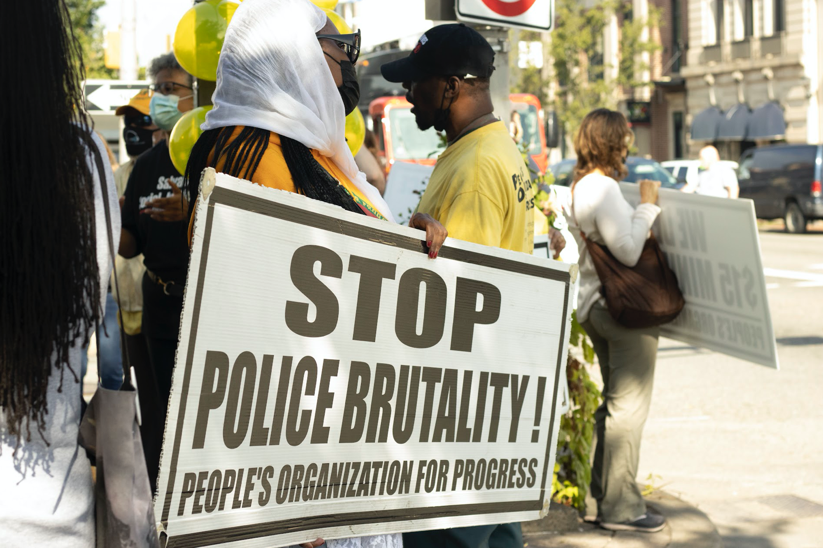 A placard being held up by a People’s Organization for Progress (POP) member at the POP’s 67-mile march for justice in Lawrence Township, NJ, Oct. 16, 2023. (Josie Gonsalves for Public Square Amplified)